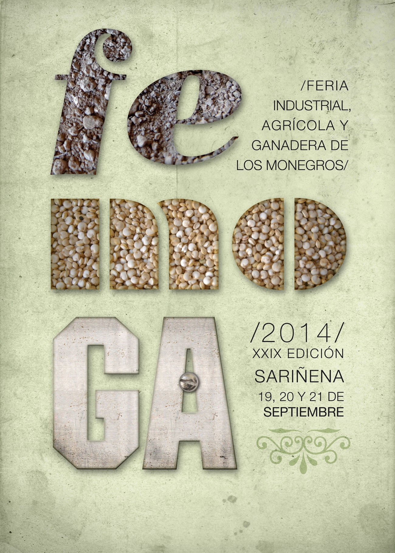 Femoga es la feria industrial, agrícola y ganadera por excelencia de la zona de Los Monegros. En esta propuesta las texturas fotográficas junto con la composición tipográfica ilustran un cartel minimalista, conceptual y de alta visibilidad.
