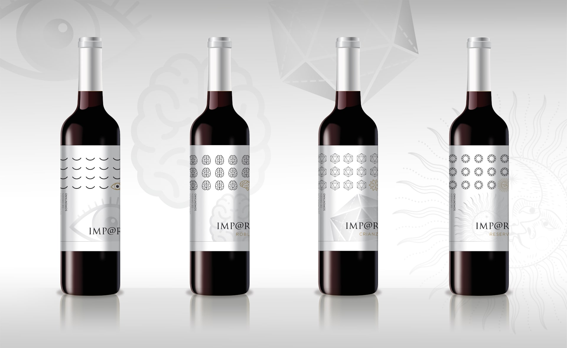 Colección de vinos que el cliente denominó “Imp@r”. El proyecto consistía en crear una imagen para una línea de vinos, fácilmente escalable a nivel gráfico pero con un sentido de colección, de conjunto, aunque pudieran funcionar visualmente por separado. Un mismo símbolo tratado de forma diferente tras una sucesión del mismo fue la excusa para crear una imagen sencilla pero gráficamente potente que se refuerza con los acabados en barniz relieve y estampado oro, dando mayor énfasis al símbolo u objeto diferente o impar, es decir, que no tiene igual.