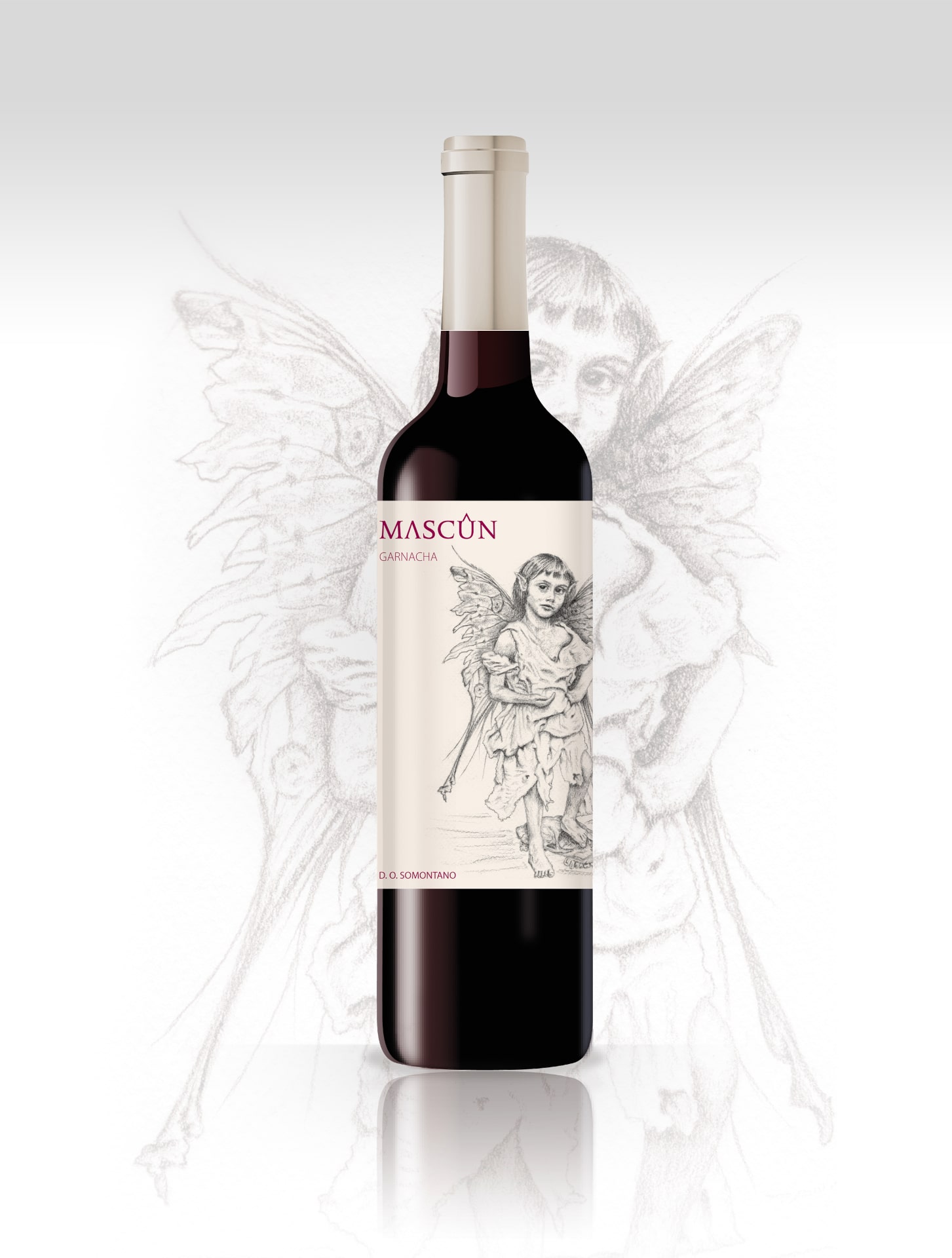 Con estas premisas y sabiendo de la originalidad, la personalidad y la riqueza en matices de los vinos “Mascún”, se propuso la creación de una ilustración que reuniera estos atributos y que fuera la imagen de la colección junto con el sutil rediseño del logotipo. Para su realización se eligió el grafito como base y el espíritu de dos mundos, el de Alicia en el país de las maravillas de Lewis Carroll y el universo de Allan Lee (El señor de los anillos) dando como resultado la imagen de un ser fantástico, del que unos dicen es un hada, otros un ser elemental pero todos coinciden en que ante su mirada cautivadora nadie se resiste a tomar una copa de los excelsos elixires que se esconden tras ella y que tal vez guarda en alguna cueva del barranco al que da nombre. Una imagen potente, evocadora, reconocible y como sus vinos, llena de matices.