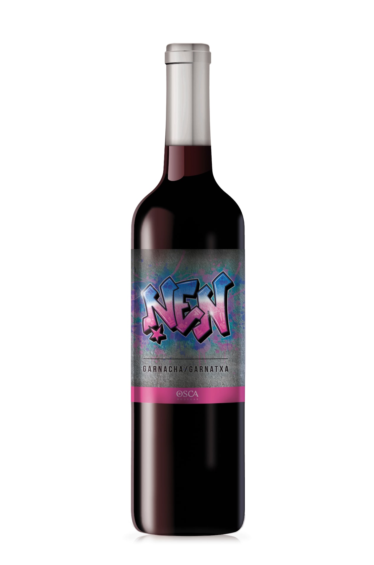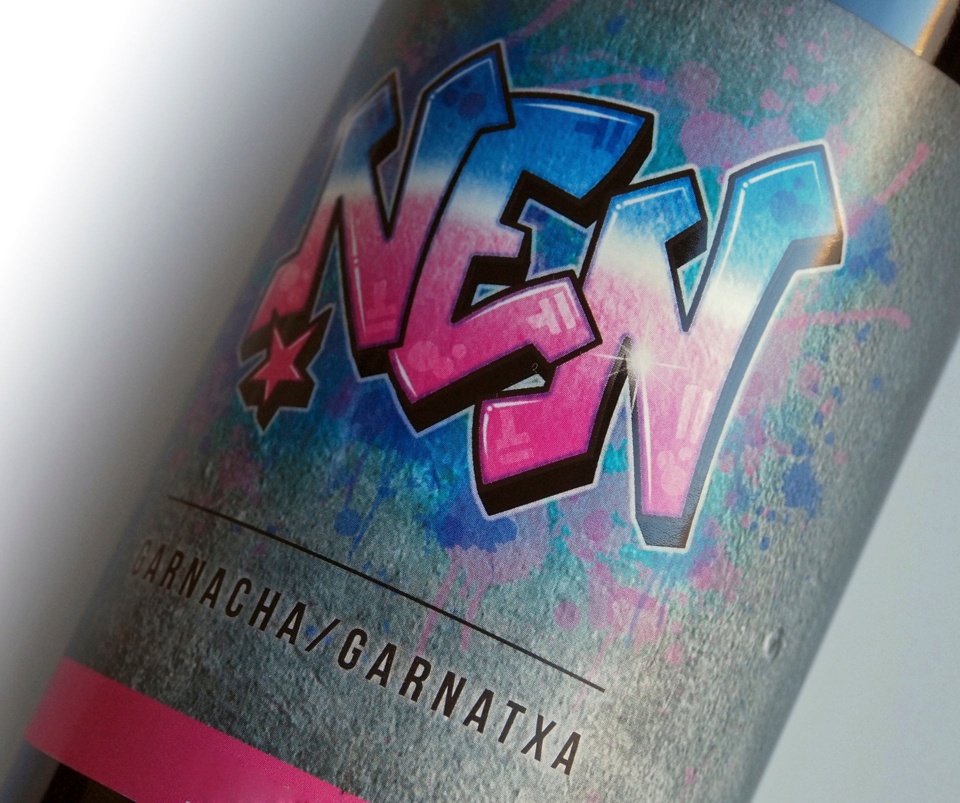 El proyecto consistió en crear la imagen para dos vinos con la marca “Nen», un chardonnay y un garnacha que se comercializarían solamente en el mercado catalán. Dirigidos a un público joven, con un precio asequible y pensados para chatear o acompañar comidas ligeras o de tapas, la solución vino –como no podía ser de otra manera– desde la calle. Con una ilustración digital creada a partir de un lettering al más puro estilo graffitero, en realidad la etiqueta plasma eso, un graffiti en miniatura sobre un muro de hormigón que en este caso es la etiqueta de papel. Bueno más concretamente dos graffitis, uno para el vino blanco y otro para el tinto, cada uno con su paleta cromática y su composición tipográfica final, solucionada en una única etiqueta que envuelve la botella casi por completo, creando una imagen detallista pero llamativa y con una gran carga de color que contrasta con el gris de ese muro-lienzo de hormigón.