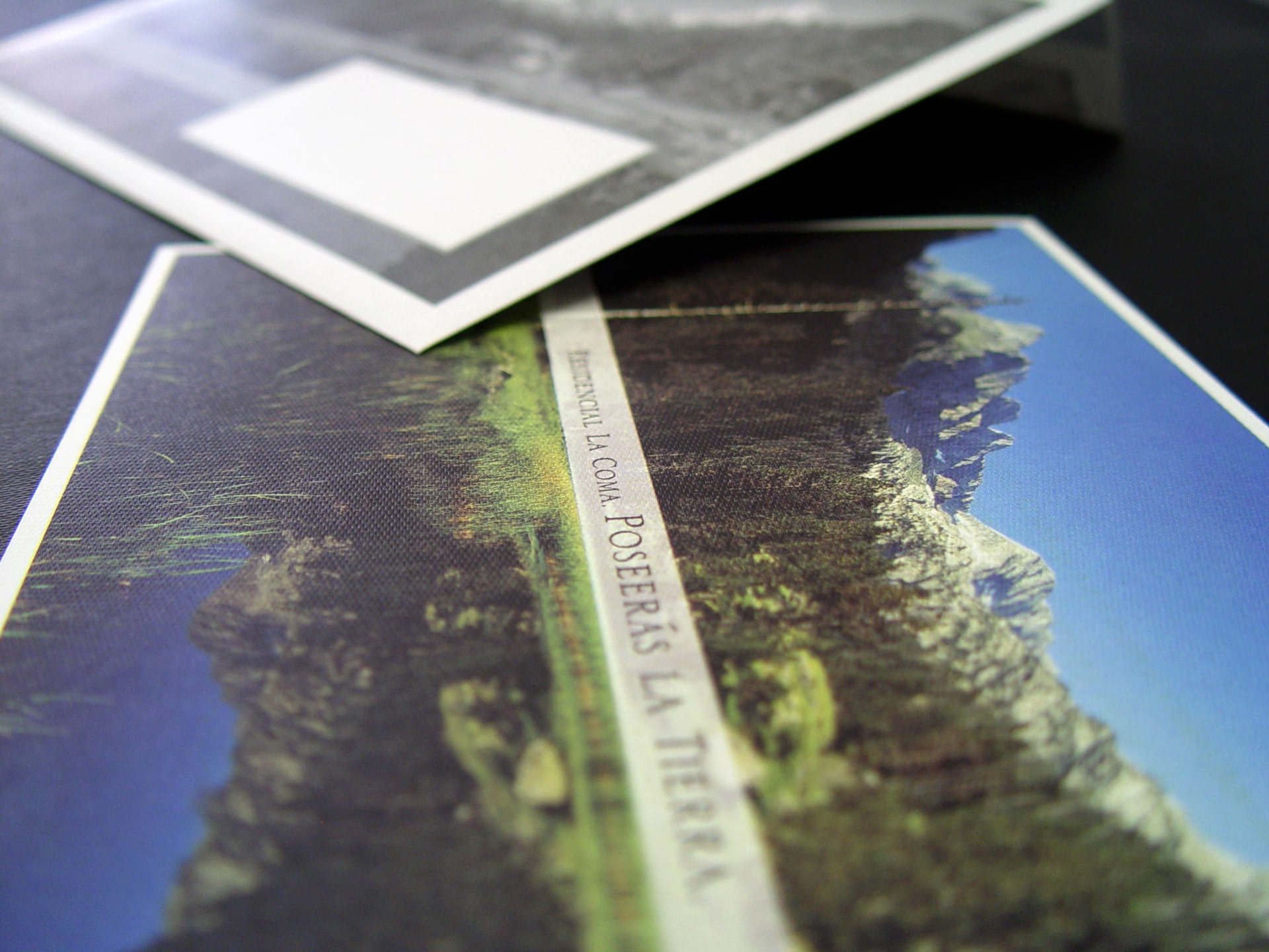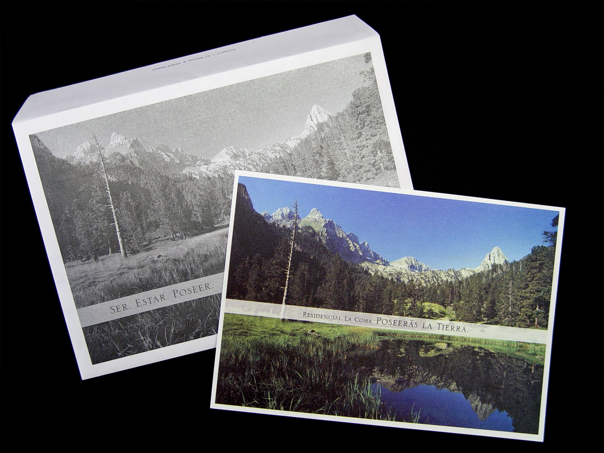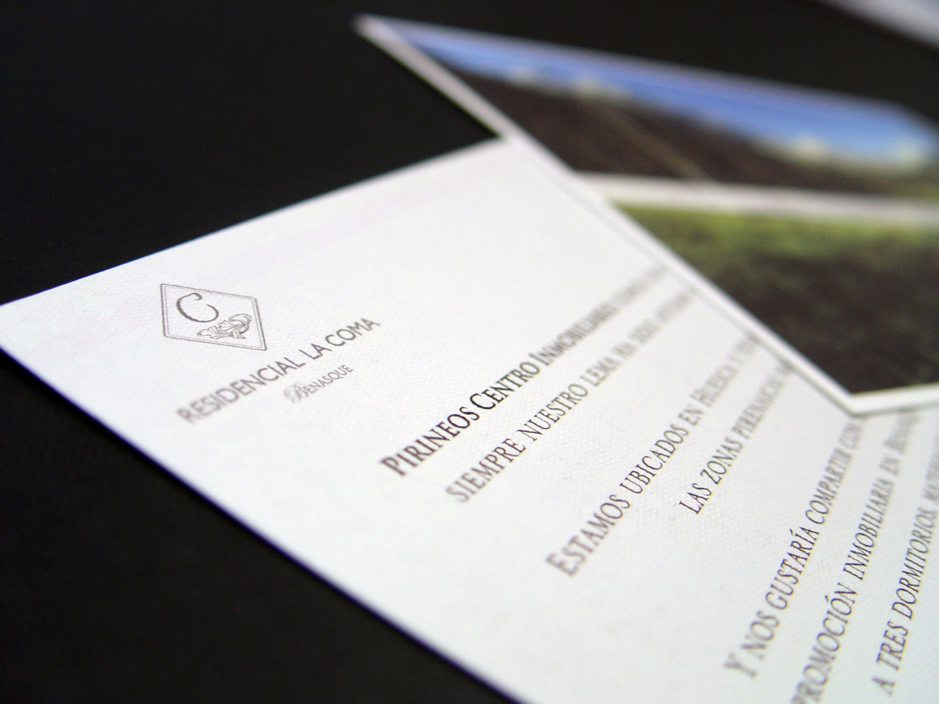 Acción de correo directo dirigido a un público objetivo de clase media-alta, para promocionar la venta en Residencial La Coma, producto inmobilario selecto situado en el Valle de Benasque, enclave turístico del Pirineo oscense. Se propuso un doble eslogan y una espectacular fotografía del entorno como única imagen. En el sobre se combinó la imagen con el primer eslogan, que sugería sin resolver el contenido y se imprimió en plata y negro, consiguiendo un conjunto-reclamo con fuerza visual, sugerente y un toque de distinción. En el folleto interior se repitió la imagen a color y se solucionó el eslogan de entrada, dejando el reverso para la información comercial. Se imprimió en Rives Design de alto gramaje consiguiendo un soporte poco frecuente para fotografías de esta naturaleza, impactante, con calidez pero con un sello de prestigio tal y como lo demandaba el producto publicitado.