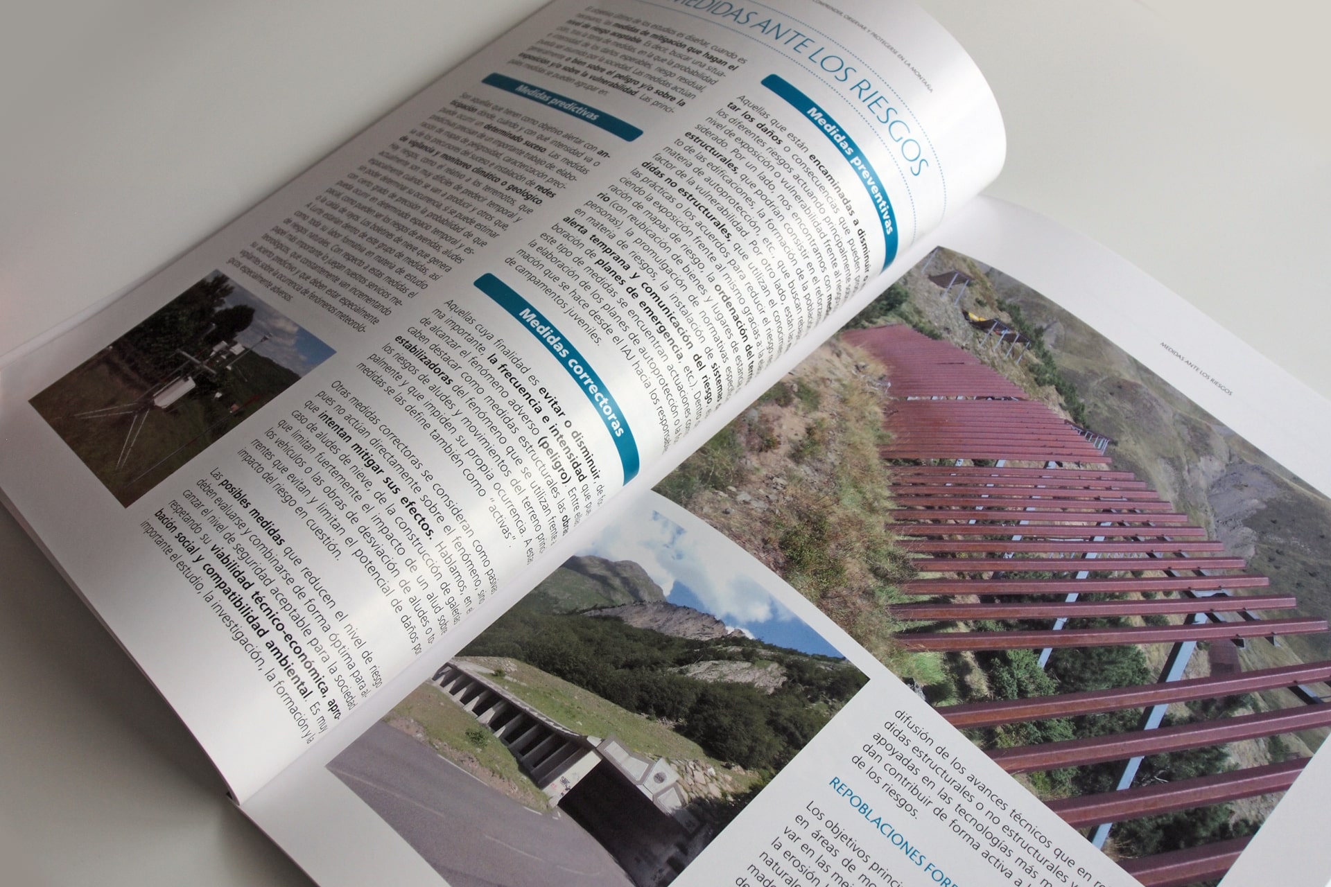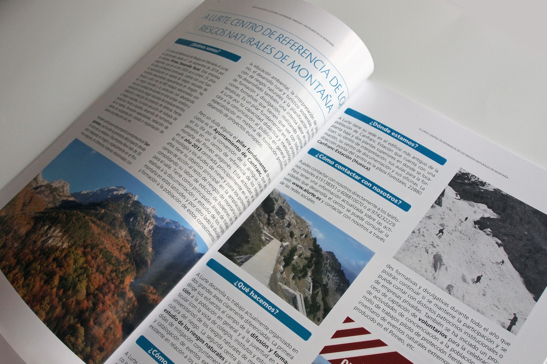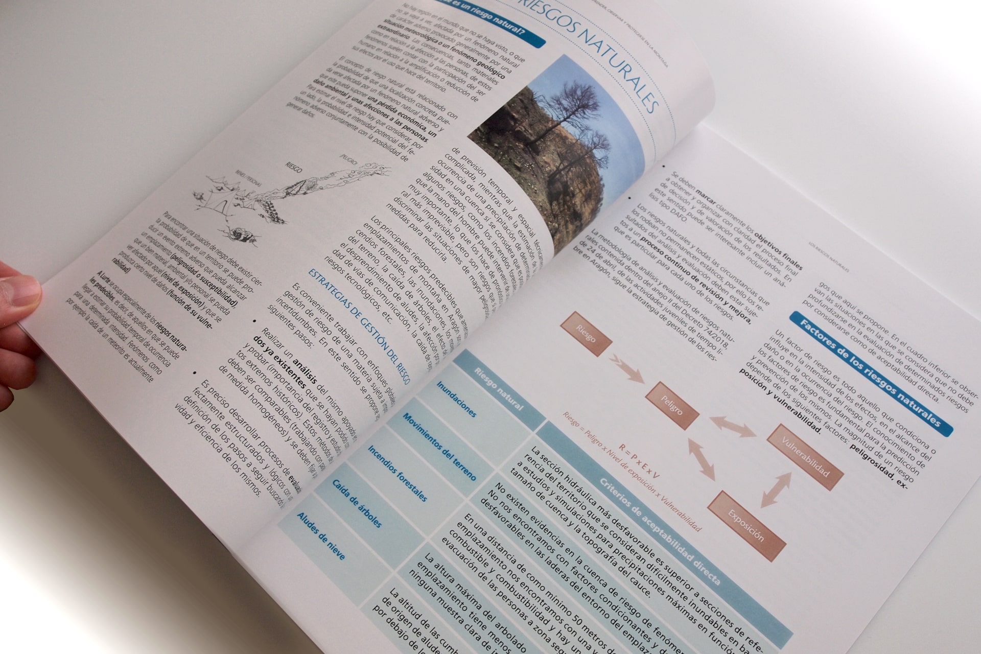 Publicación de 64 páginas maquetada a dos columnas. Con un diseño limpio y ágil esta completa guía sobre riesgos naturales alberga una notable cantidad de información en forma de textos, fotografías, gráficos e ilustraciones que facilita su lectura y potencia el carácter visual de los contenidos.